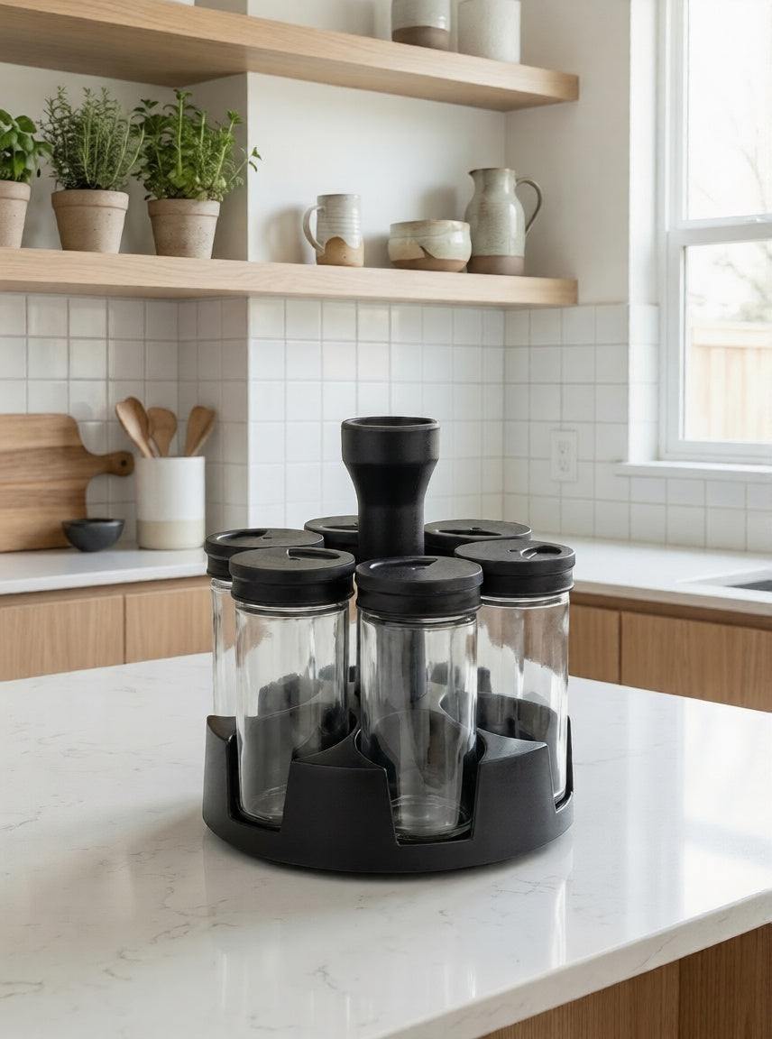 Eleva el estándar de tu cocina y transforma cada preparación en una experiencia gourmet. Este exclusivo Condimentero Giratorio combina a la perfección la elegancia del vidrio con la resistencia del acero, ofreciéndote la solución definitiva para mantener tus especias favoritas siempre frescas y al alcance de tu mano.
